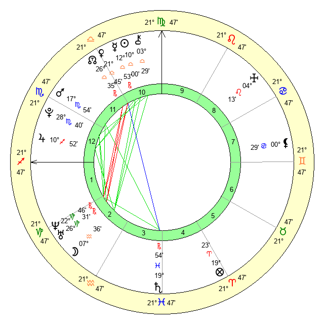 | Venus | 21 Libra 46 | 17 Virgo 24 | 29 Scorpio 6 |