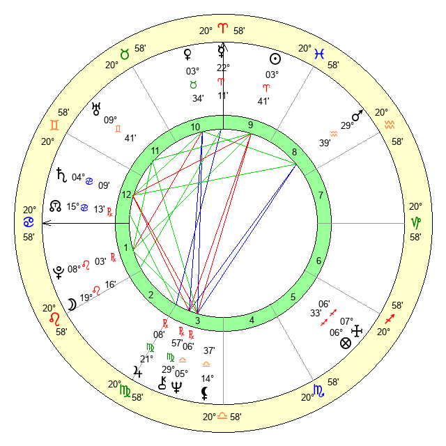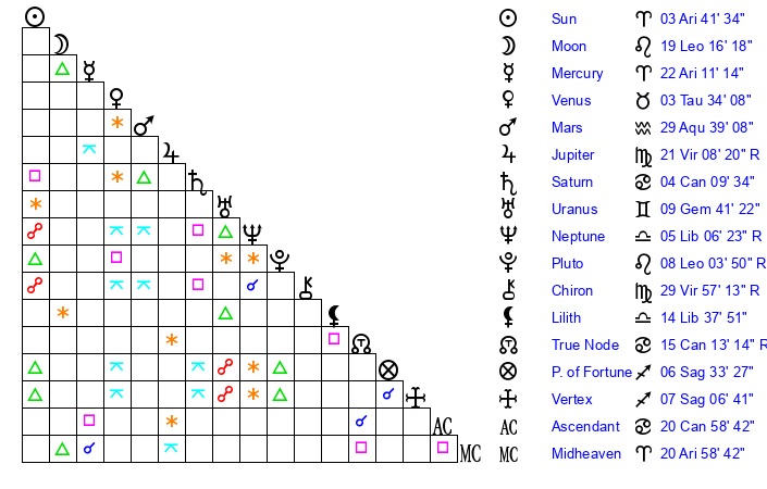 | Sun | 3 Aries 42 | 4 Aries 18 | 21 Gemini 20 |