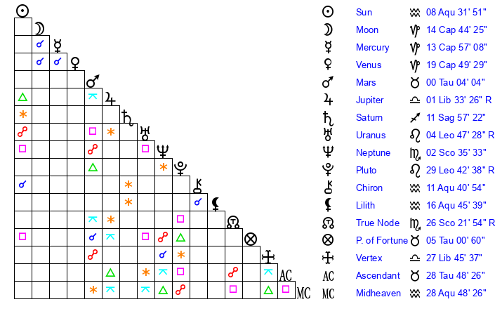 | Venus | 19 Capricorn 49 | 24 Pisces 45 | 14 Aries 36 |