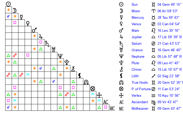 | Sun | 4 Gemini 50 | 5 Gemini 42 | 20 Leo 19 |