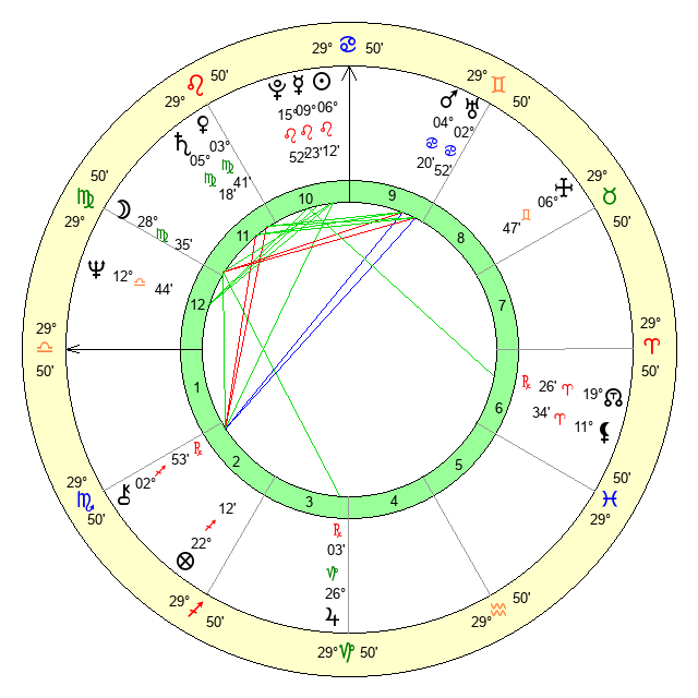 | Moon | 28 Virgo 33 | 5 Libra 49 | 2 Cancer 36 |