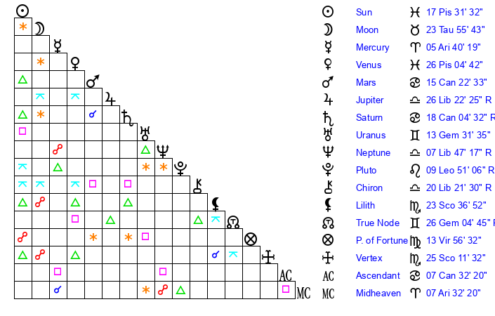 | Sun | 17 Pisces 32 | 18 Pisces 22 | 4 Gemini 50 |