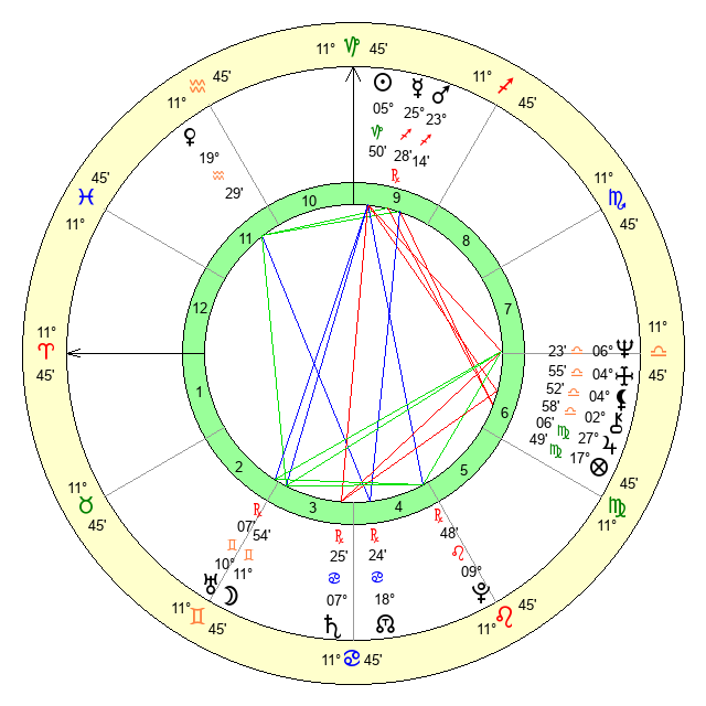 | Moon | 11 Gemini 57 | 5 Aries 7 | 1 Gemini 6 |