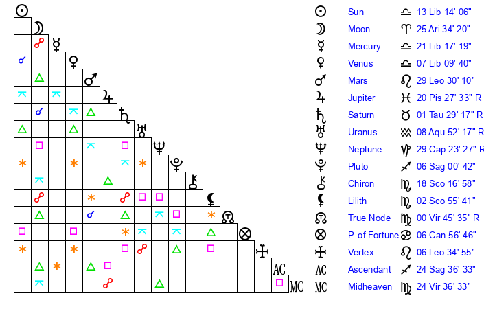 | Moon | 25 Aries 26 | 7 Aries 24 | 18 Aries 29 |