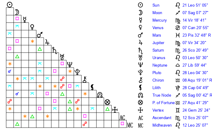 | Pluto | 28 Leo 4 | 2 Aquarius 6 | 0 Virgo 2 |