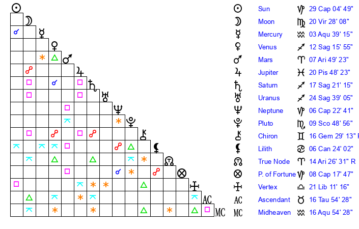 | Moon | 20 Virgo 28 | 6 Libra 37 | 19 Aquarius 40 |