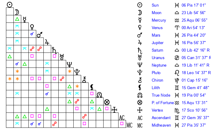 | Neptune | 19 Libra 11 | 28 Pisces 46 | 17 Libra 20 |
