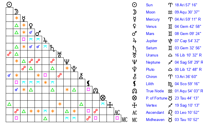 | Sun | 18 Aries 57 | 19 Aries 6 | 10 Gemini 19 |