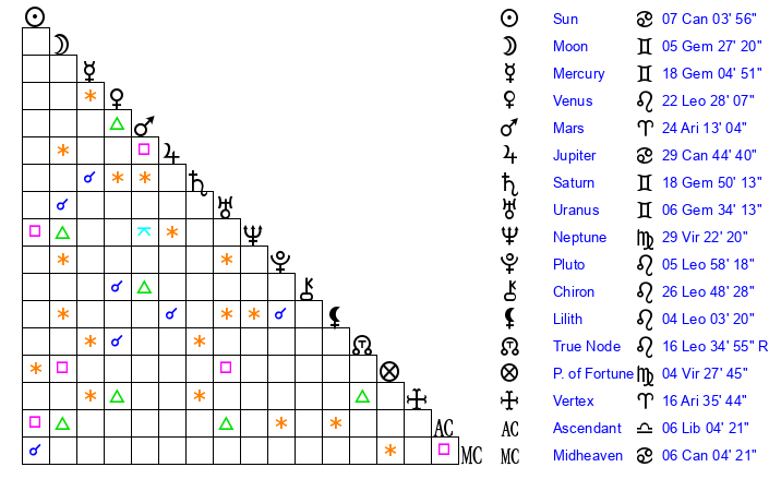 | Moon | 5 Gemini 20 | 2 Virgo 54 | 7 Gemini 48 |