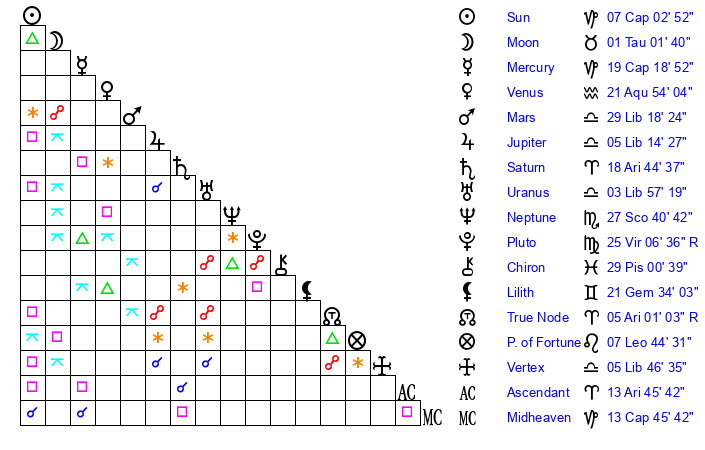 | Moon | 1 Taurus 2 | 10 Sagittarius 59 | 17 Taurus 32 |