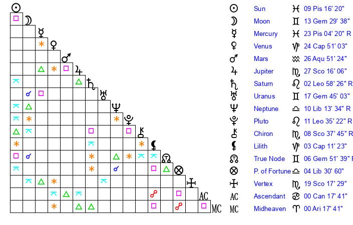 | Moon | 13 Gemini 39 | 19 Pisces 32 | 17 Aries 50 |