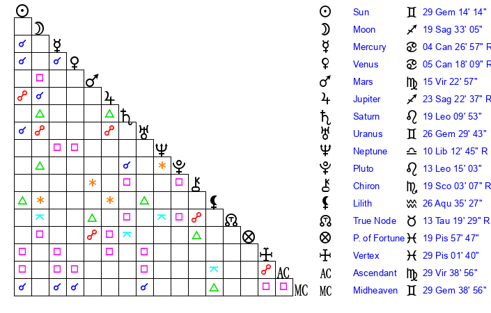 | Sun | 29 Gemini 14 | 29 Gemini 37 | 13 Virgo 1 |
