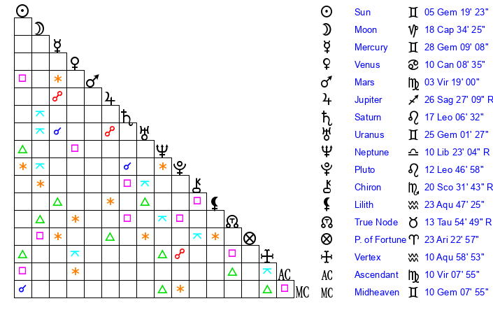 | Sun | 5 Gemini 19 | 5 Gemini 42 | 18 Leo 54 |
