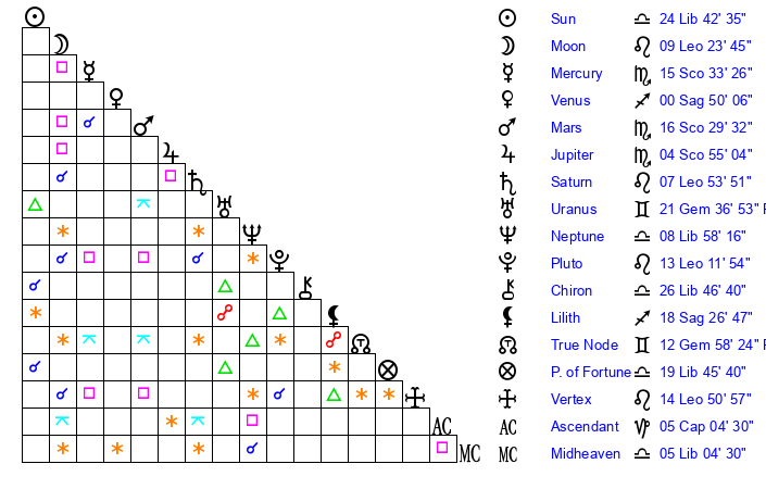 | Neptune | 8 Libra 59 | 0 Aries 4 | 10 Libra 48 |