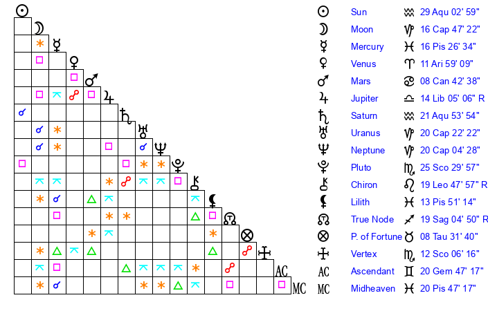| Saturn | 21 Aquarius 50 | 19 Pisces 15 | 25 Aquarius 29 |