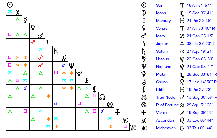| Moon | 15 Scorpio 34 | 1 Virgo 40 | 18 Capricorn 0 |