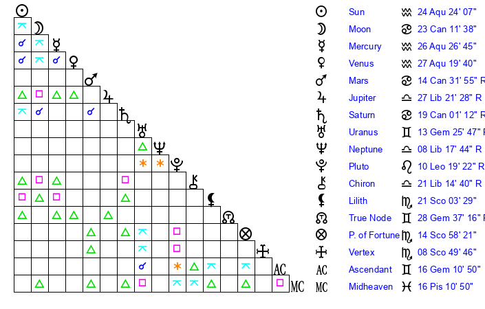 | Sun | 24 Aquarius 24 | 25 Aquarius 15 | 12 Taurus 39 |