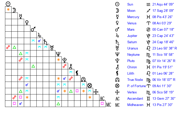 Sun | 21 Aquarius 44 | 22 Aquarius 12 | 25 Aries 29 |