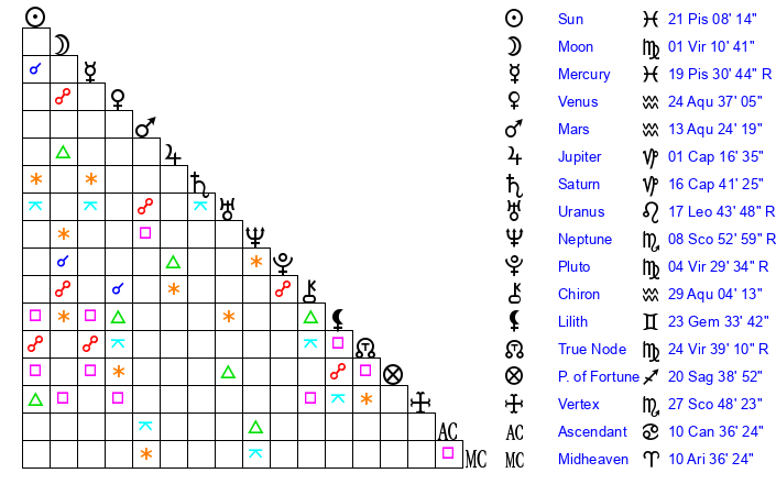 | Sun | 21 Pisces 8 | 21 Pisces 22 | 24 Taurus 50 |