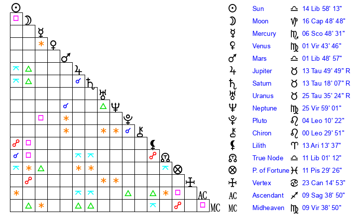 | Neptune | 26 Virgo 0 | 0 Aries 20 | 27 Virgo 42 |