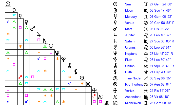 | Saturn | 28 Scorpio 0 | 1 Aries 19 | 27 Scorpio 12 |