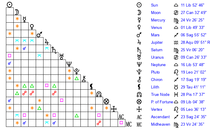 | Mercury | 24 Virgo 26 | 28 Libra 30 | 16 Capricorn 54 |