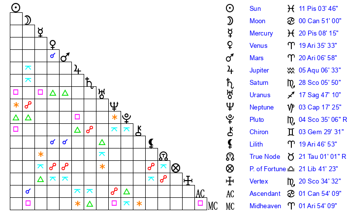 | Venus | 19 Aries 35 | 10 Aries 50 | 10 Aries 2 |
