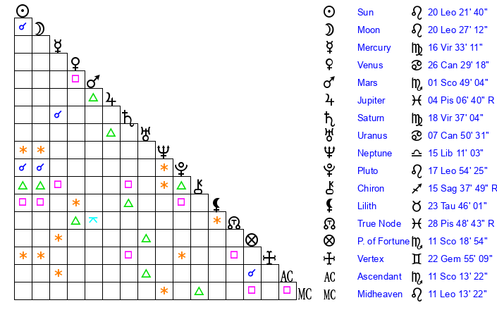 | Pluto | 17 Leo 54 | 2 Aquarius 7 | 19 Leo 42 |