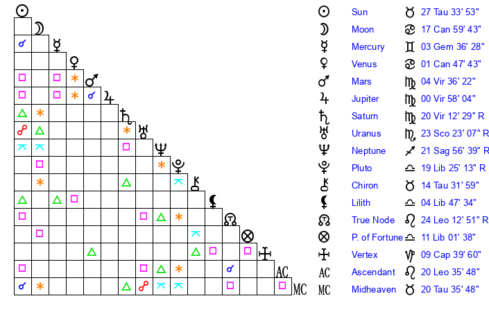 | Mars | 4 Virgo 36 | 13 Leo 59 | 25 Virgo 25 |