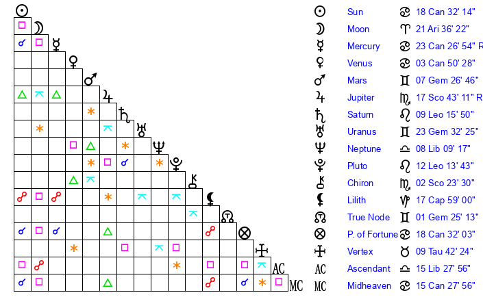 | Sun | 18 Cancer 32 | 19 Cancer 38 | 3 Libra 44 |