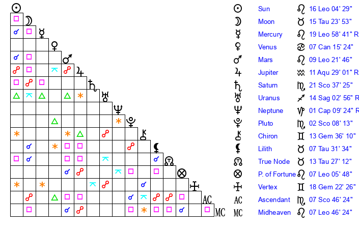 | Sun | 16 Leo 5 | 16 Leo 24 | 24 Virgo 44 |