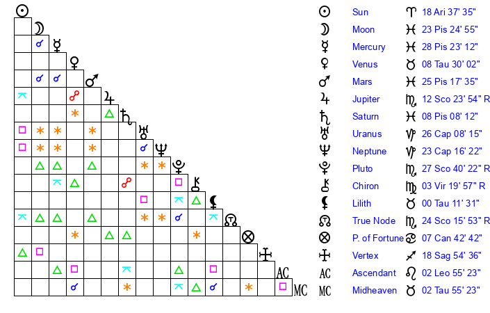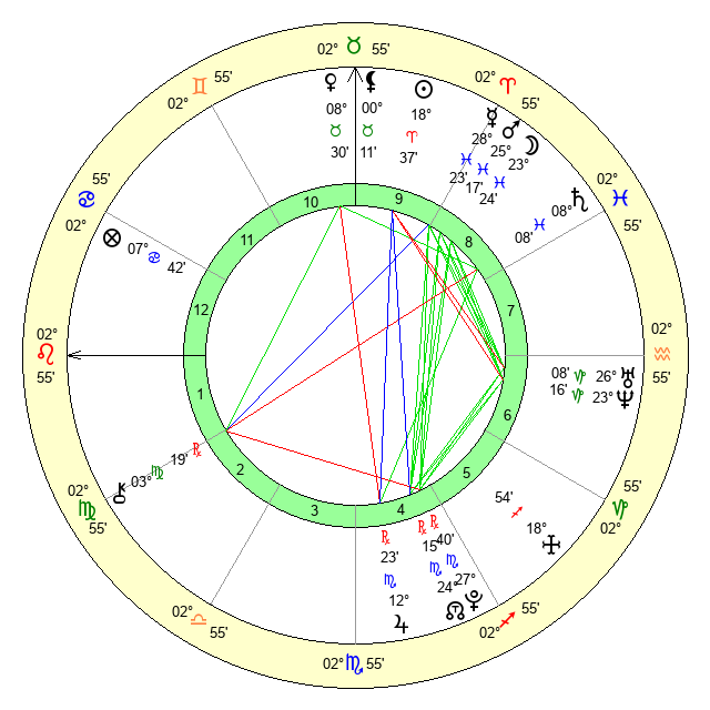 | Moon | 23 Pisces 17 | 1 Virgo 40 | 7 Taurus 54 |