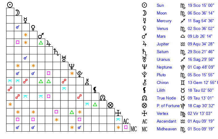 | Pluto | 5 Scorpio 15 | 1 Aquarius 33 | 6 Scorpio 38 |