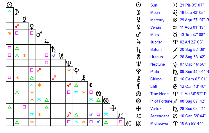 | Mercury | 29 Aquarius 57 | 9 Aries 7 | 11 Aries 19 |