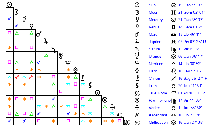 | Moon | 21 Gemini 2 | 12 Aquarius 59 | 26 Pisces 27 |