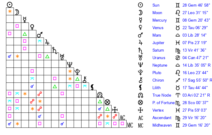 | Sun | 28 Gemini 47 | 29 Gemini 37 | 10 Virgo 36 |
