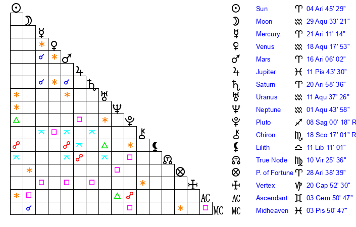 | Moon | 29 Aquarius 38 | 13 Aquarius 15 | 24 Aquarius 4 |