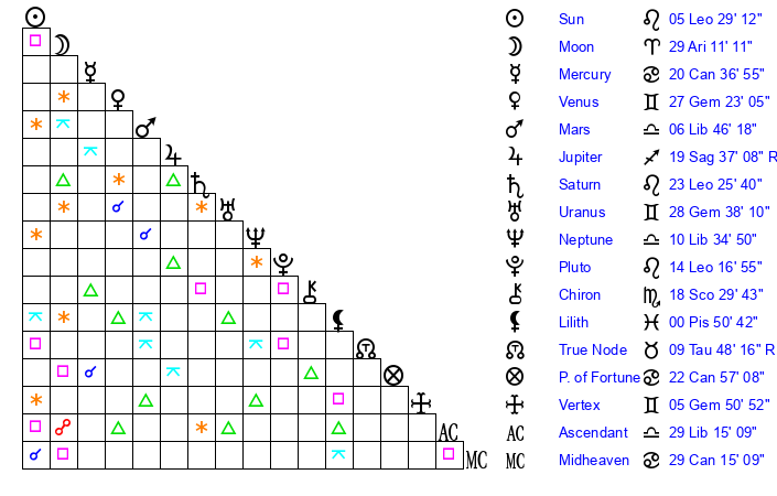 | Moon | 29 Aries 3 | 23 Virgo 28 | 2 Pisces 2 |