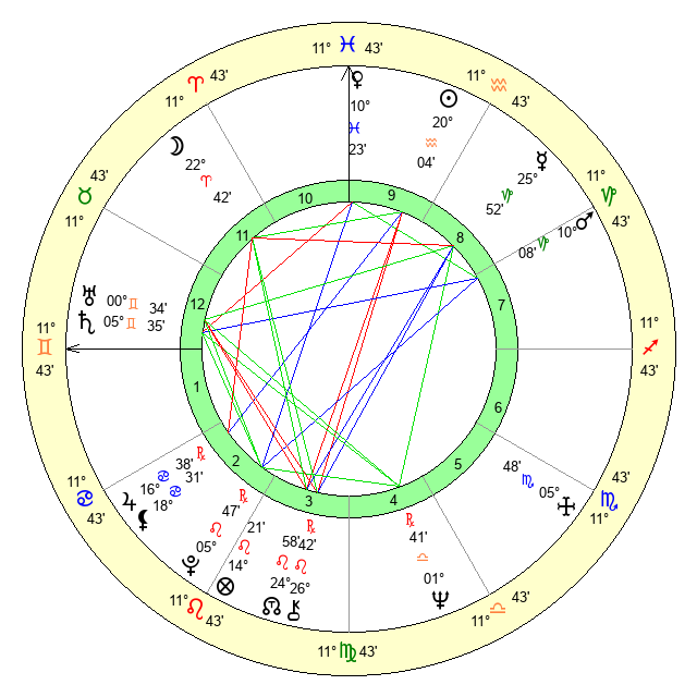 | Saturn | 5 Gemini 53 | 18 Pisces 19 | 11 Gemini 44 |