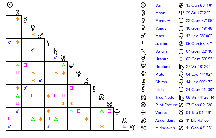 | Moon | 29 Aries 20 | 27 Scorpio 25 | 11 Taurus 24 |