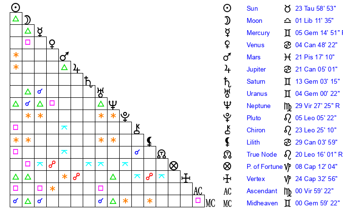 | Moon | 1 Libra 5 | 28 Sagittarius 30 | 2 Libra 7 |