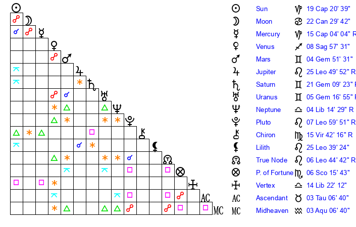 | Pluto | 7 Leo 59 | 1 Aquarius 22 | 6 Leo 28 |