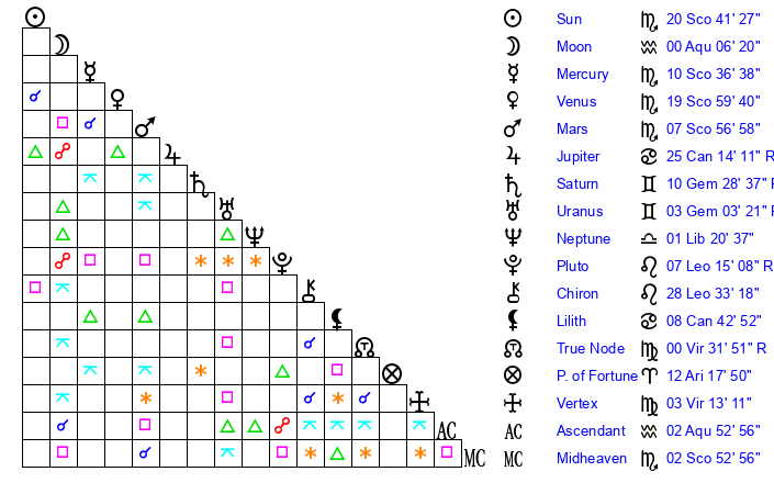 | Sun | 20 Scorpio 41 | 21 Scorpio 34 | 15 Aquarius 1 |