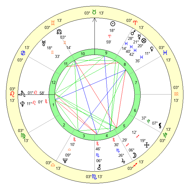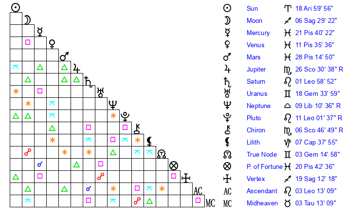 | Sun | 19 Aries 0 | 20 Aries 5 | 4 Cancer 14 |