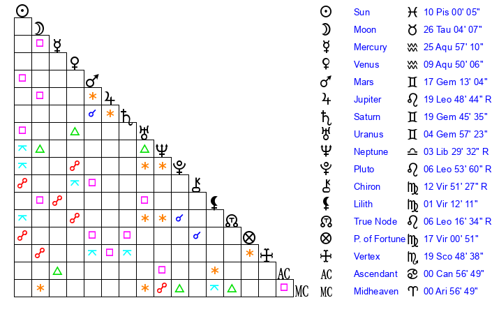 | Sun | 10 Pisces 0 | 11 Pisces 22 | 29 Taurus 32 |