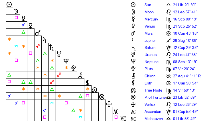 | Moon | 13 Leo 0 | 3 Leo 23 | 0 Capricorn 18 |