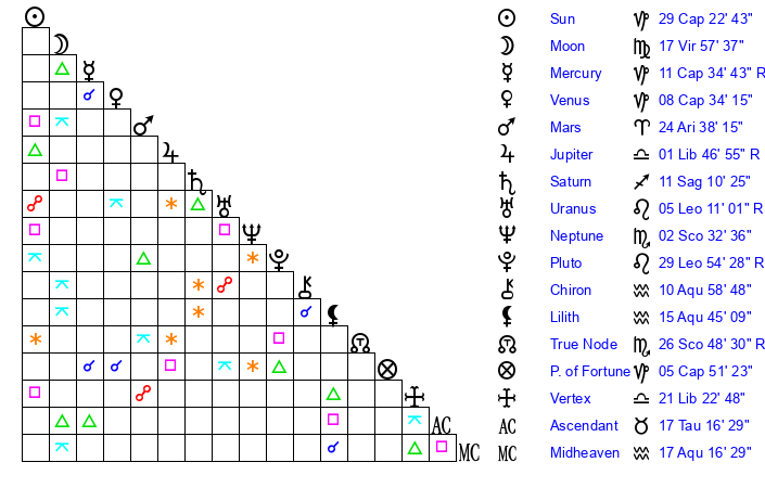 | Venus | 8 Capricorn 34 | 16 Pisces 42 | 3 Aries 26 |