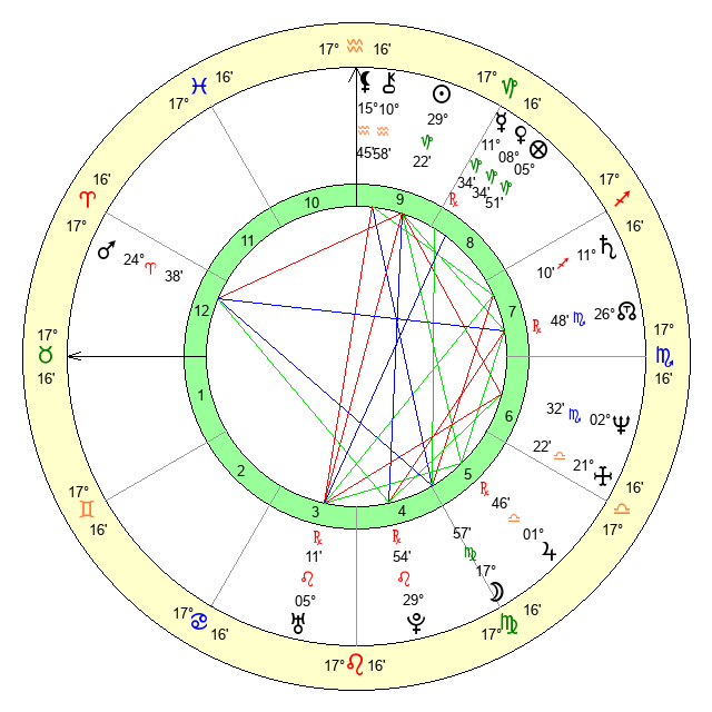 | Moon | 17 Virgo 45 | 6 Libra 37 | 7 Pisces 52 |
