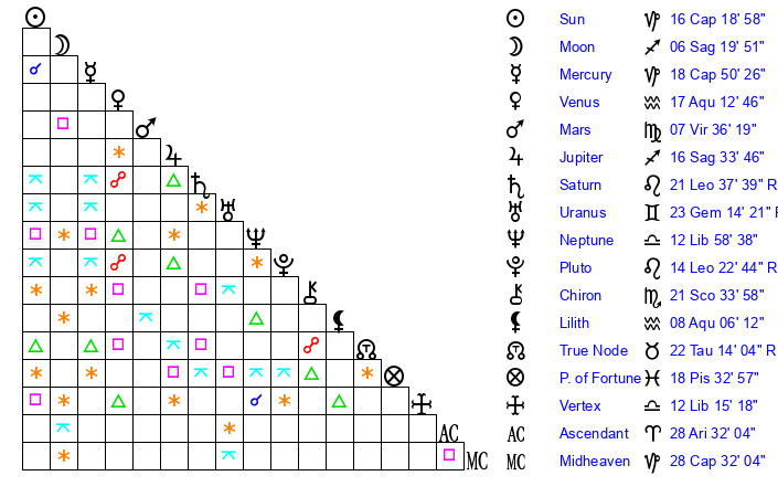 | Neptune | 12 Libra 58 | 29 Pisces 35 | 11 Libra 48 |