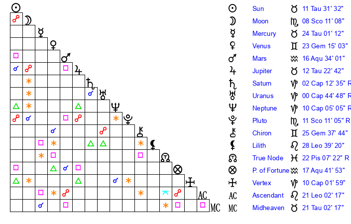 | Pluto | 11 Scorpio 10 | 3 Aquarius 48 | 10 Scorpio 13 |